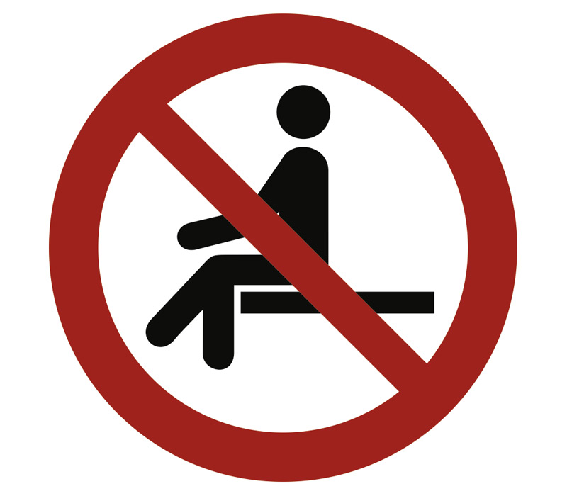 Es gibt einige Flächen, die nicht zum Sitzen vorgesehen sind, z.B. Fensterbretter, Handgeländer oder Brüstung. Für die Bezeichnung des Sitzverbots darauf wird das Verbotsschild "Sitzen verboten" eingesetzt. Es wird aus selbstklebender Folie hergestellt und hat den Durchmesser 100 mm. Dieses Schild ist gemäß DIN EN ISO 7010, P018 gefertigt.